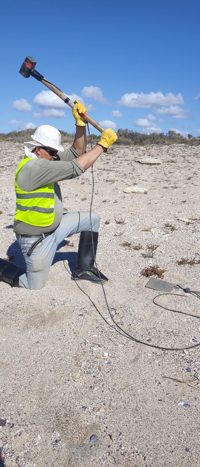 Realización de estudio de suelos para caracterización geotécnica del área del futuro emplazamiento de la “Planta de gas licuado GNL Ar” de YPF-SHELL en cercanías de la localidad de Sierra Grande. Ejecución de varios sondeos en tierra. Ejecución de ensayos de sísmica de refracción SASW y resistividad eléctrica Wenner. YPF-SHELL. Marzo 2025.