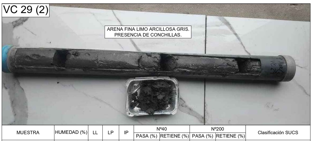 La empresa Hidra Argentina S.A. solicita a Reyes y Asociados S.A el estudio y procesamiento de las muestras de vibrocore recolectadas a lo largo del canal de navegación del estuario de Bahía Blanca y abarcará los siguientes análisis: - Análisis granulométrico mediante tamizado de la muestra. - Determinación del contenido de humedad. - Caracterización geotécnica según el Sistema Unificado de Clasificación de Suelos.